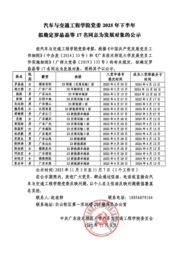 汽车与交通工程学院党委2025年下半年拟确定罗晶晶等17名同志为发展对象的公示
