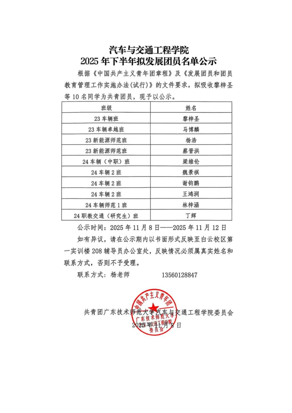 汽车与交通工程学院2025年下半年拟发展团员的公示