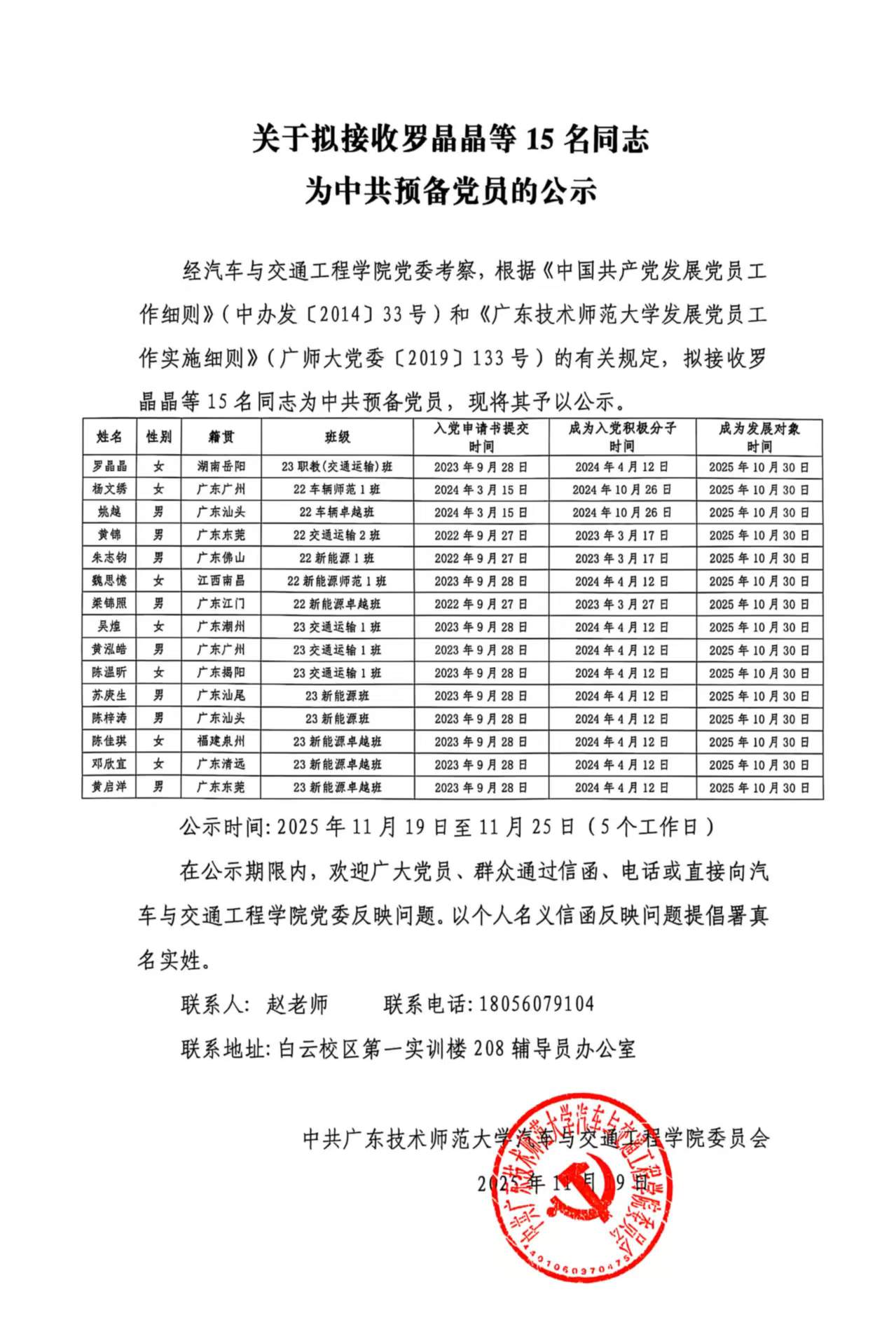 汽车与交通工程学院党委2025年下半年拟吸收罗晶晶等15名同志为预备党员的公示