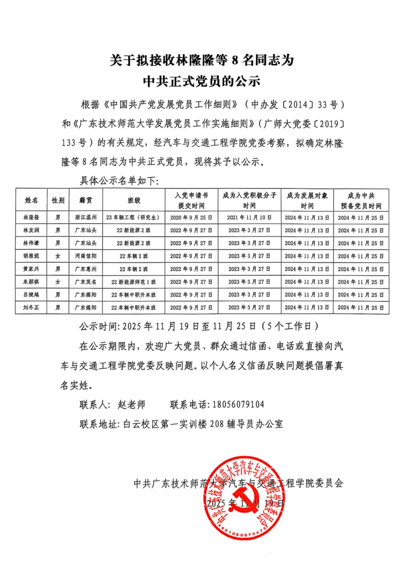 关于拟接收林隆隆等8名同志为中共正式党员的公示