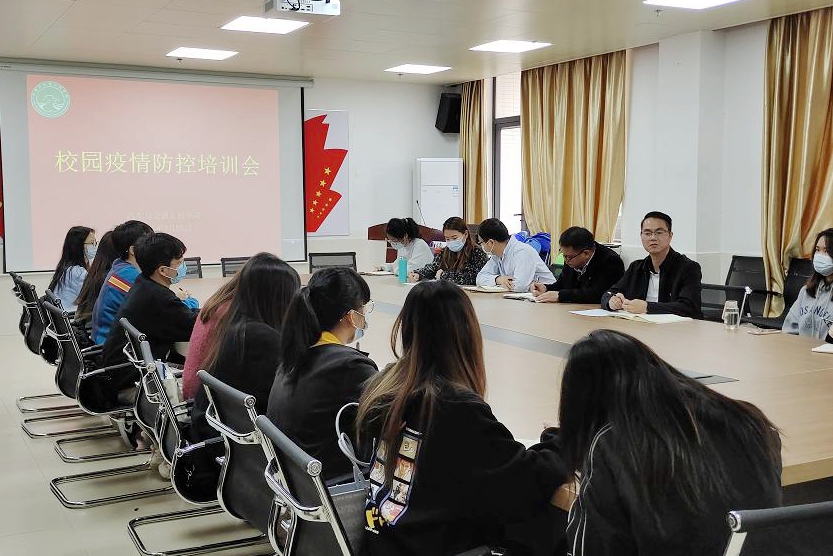 学院党总支副书记何伟强对疫情防控工作进行了进一步部署,并对与会人员开展了校园疫情防控工作培训。