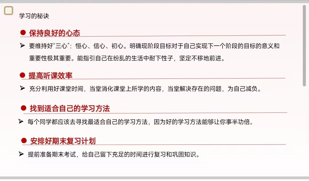会上,邀请五位同学就学习方法、比赛经历、人际交往等方面分享她们的宝贵经验,并希望同学们都能明确自己的目标,持久的努力,做好人生规划。