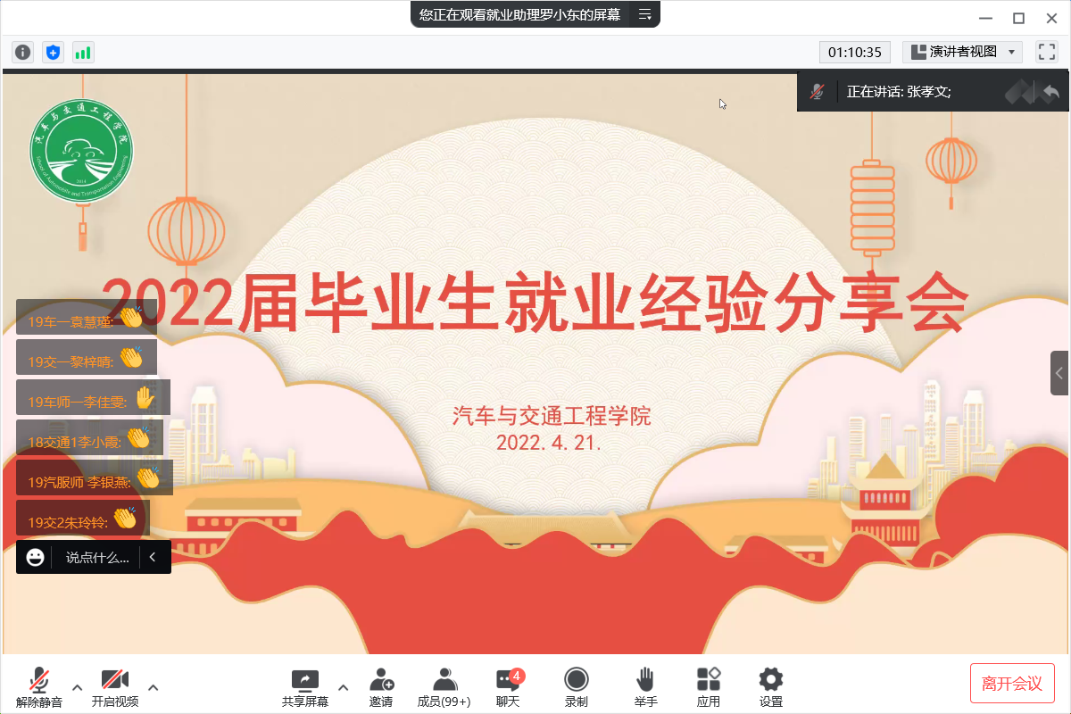 4月21日,我院通过线上方式举办了2022届毕业生求职就业经验分享会。学院领导班子成员、辅导员、班主任、部分22届、23届学生共300余人参加了本次分享会。