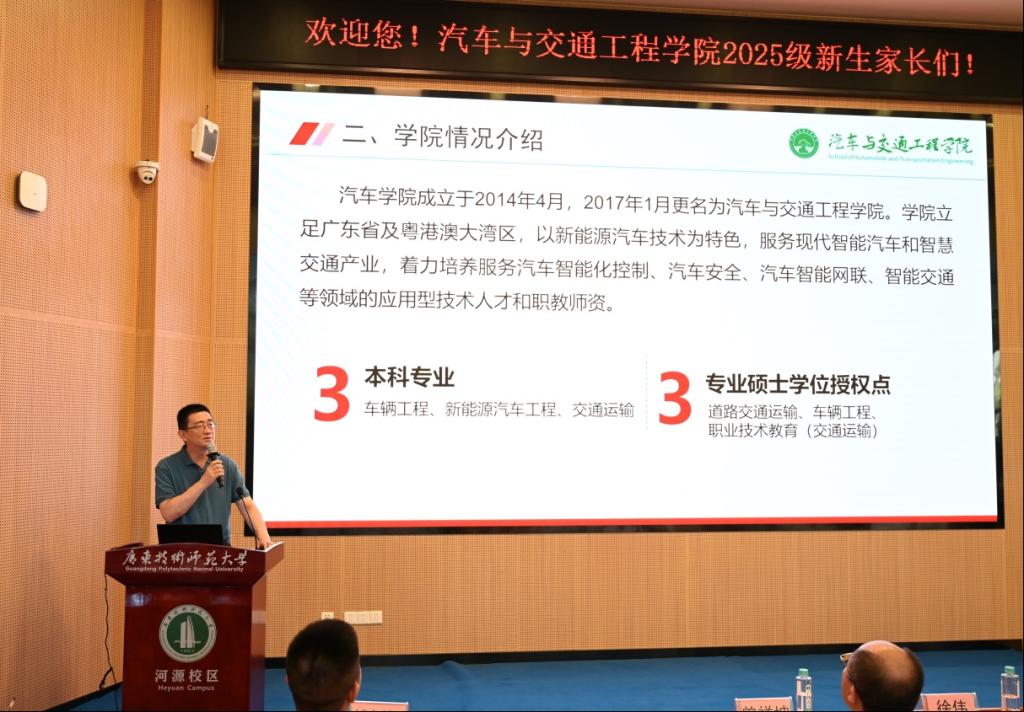 为加深新生家长对学院办学特色和育人理念的了解,搭建家校协同育人沟通平台,9月11日新生入学当天下午,汽车与交通工程学院在河源校区举办“家校同驱、启智护航”2025级本科新生家长见面会,学院领导、辅导员代表、新生班主任代表、部分新生家长近180人出席会议,共同为新生成长与发展凝聚家校合力。