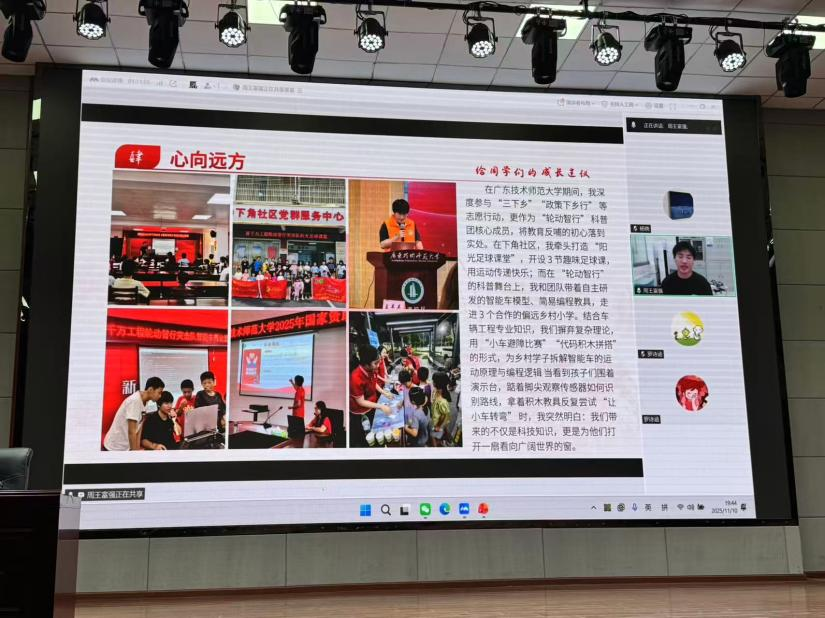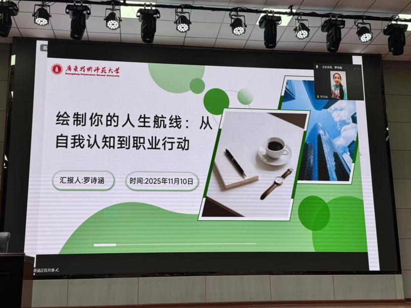 职业技术教育(交通运输)专业研究生罗诗涵利用十五运比赛志愿服务间隙,在天河体育中心进行远程连线。她以《绘制你的人生航线:从自我认知到职业行动》为题,基于前期对汽修系学生的问卷调研,为同学们系统剖析职业发展的三大赛道,并针对学生普遍存在的四大困惑提供了专业建议。她还援引曾晓涵、肖政延、蔡晓钧等三位汽院学子的中职升本经历,生动展现职业教育与个人成长的多元可能性,为同学们打开视野。
