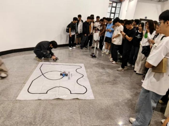 活动结束后,在门口展示的循迹小车等参赛作品吸引很多学生围观,这是从图纸设计到实物运转,这些作品是看得见、摸得着的实践教材,进一步点燃大一学生的参与热情。