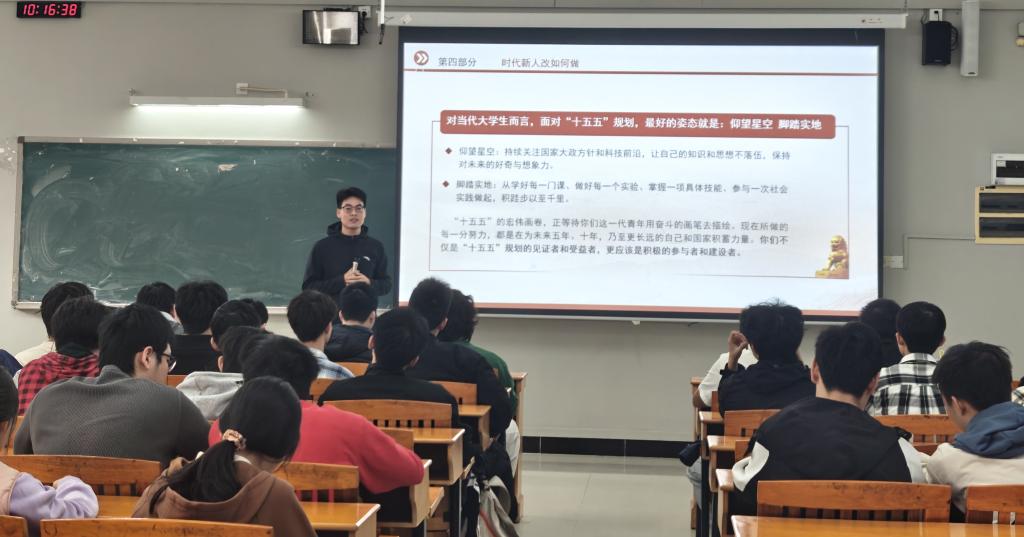 以“解读党的二十届四中全会精神”为主题,赵猛从全会概况、“十四五”时期发展成就、“十五五”时期战略部署以及青年学生的实践方向四个方面进行了系统阐述。回顾“十四五”的辉煌成就,赵猛重点列举了我国在科技创新与国防建设等领域取得的重大突破,指出该时期我国经济实力、科技实力和综合国力显著跃升,尤其在5G通信、新能源等前沿领域已跻身世界前列。展望“十五五”的光明前景,他重点梳理了“十五五”时期涵盖现代化建设、科技自立自强等在内的12项重要战略部署。
