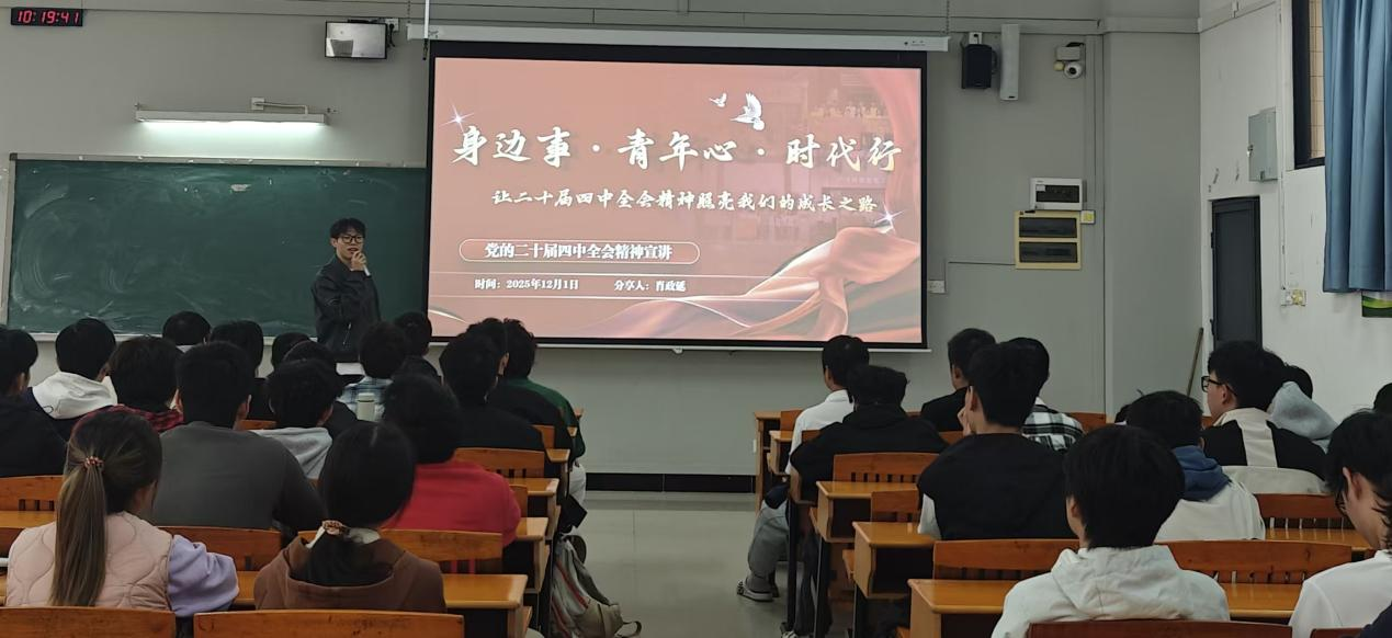 根据《中共广东省委关于认真学习宣传贯彻党的二十届四中全会精神的通知》及省委教育工委相关部署要求,我院紧紧围绕“六个一百”宣讲行动安排。12月1日,学院邀请优秀学生党员,21级中职升本班毕业生、现机电学院研究生肖政延进行分享。2023级、2024级车辆工程(中职升本班)学生参与本次宣讲,辅导员杨馥莉主持本次活动。